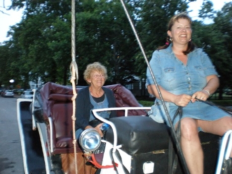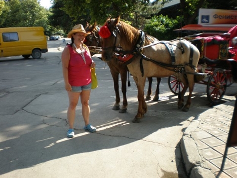 Og der satt jeg, som veldig tydelig både turist og dame og kjørte hestedrosjen, mens han satt sammen med meg på kuskebukken, og tutet med hornet og vinket til kollegaer som ristet på hodet, mens vi kjørte gjennom handlegaten midt i Albena!