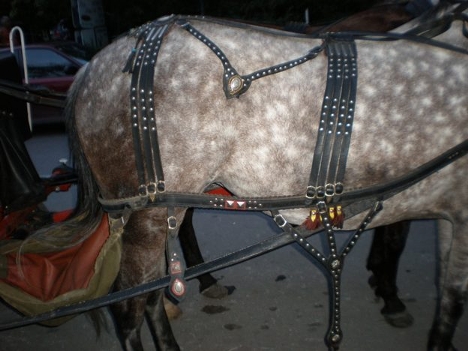 Dessverre ble det ikke noen skikkelige bilder av meg og kjøringen. Drosjekusken "min" prøvde å ta bilder for meg da vi kom tilbake, men han holdt ikke kameraet stille, så de ble temmelig uklare. Men jeg tok masse bilder av hestene etterpå. Jeg må si jeg er veldig fascinert av selene de bruker, jeg synes de er utrolig dekorative. Og når noen av ekvipasjene i tillegg har blomstermalte bogtrær blir det ekstra flott.