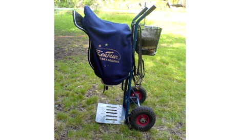 Mitt bidrag til konkurransen deres er en utstyrstralle. For alle som har en viss avstand mellom hvor hestene står/stelles og utstyret oppbevares, kan denne være fin. Kan også være grei på sommerbeiter og om man er på farten. Har noen venninner som har laget maken allerede og vil gjerne dele ideen med flere. Jeg har brukt en sekketralle fra Biltema som utgangspunkt (kr. 299,-). Så er det festet på en plate med salhenger og satt på en sykkelkurv. Denne er fin både til å kjøre utstyr og fôrsekker på og blir mye rimligere enn å kjøpe utstyrstralle fra forhandler. Dette er et bidrag i konkurransen Praktiske løsninger. På denne samlesiden finner du alle bidragene som hittil er publisert. I vårt forum kan du diskutere de ulike forslagene.
