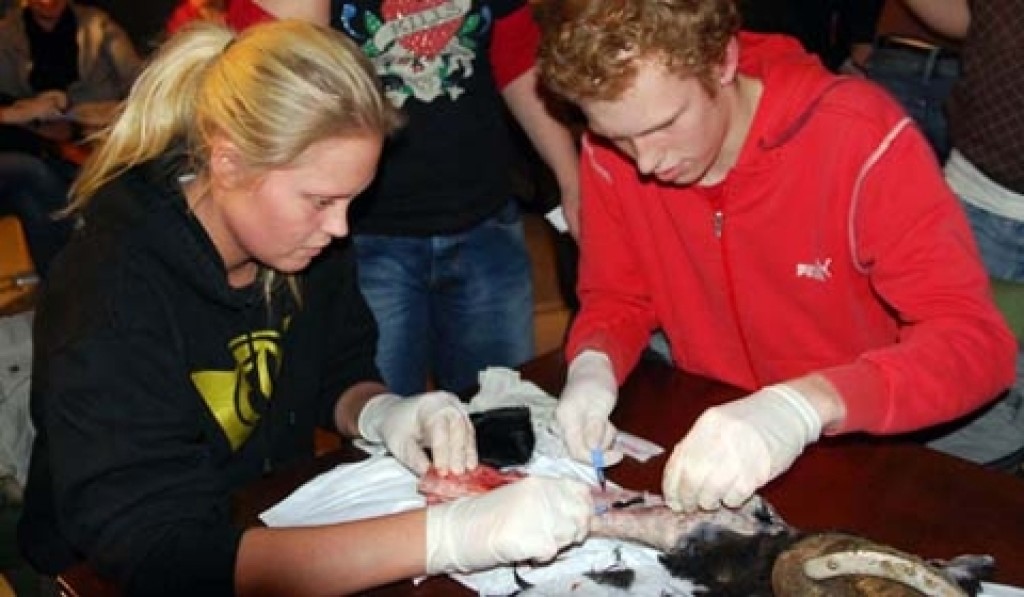 Veterinær Svein H. Bakke holdt foredrag om skader og fysiologi med ben fra avdøde hester på Ellingsrud Ridesenter. Alle fikk muligheten til å ta og skjære i bena.