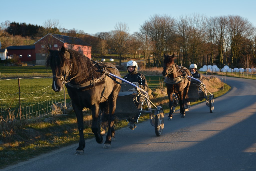 Solør Svarten og Edwin leder an foran Geir Gudmestad og Bjørkeviking under en skrittetur i trykkvogn i morgensolen.