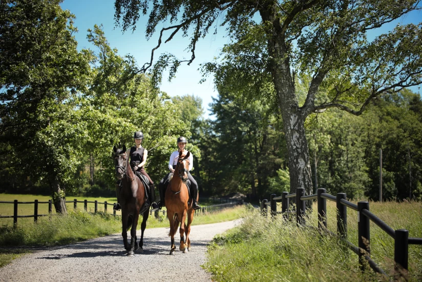 Variert trening er viktig for å skape trygge og sunne hester – her er to unghester ute på en av sine første skogsturer. Foto: Andresen Dressage