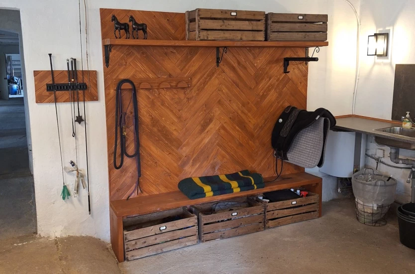 – Jeg ønsket at stallen ikke bare skulle være komfortabel for hestene mine, men også for besøkende fagfolk og meg som hesteeier og rytter, sier Ann, som har laget noen ryddige oppbevaringsløsinger.