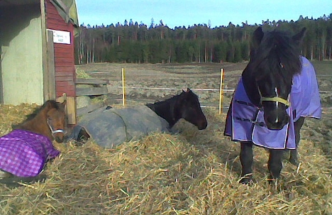 En hel uke hadde vi ulven i nærmiljøet her, rådyrene som pleide å gå på jordet var ikke hindret av noe gjerdet så de holdt seg unna, men det kunne ikke hestene. I den uken gikk de tett sammen, det var sjeldent mer enn en meter mellom hver hest. De drakk sammen, og de spiste sammen, og mens føllet var så lite at det måtte ha hvile liggende i løpet av døgnet, så ikke jeg de to store hestene liggende hele uka. Føllet derimot fikk hvilen sin liggende mellom de to store, eller inne i brakka med en eller to store stående foran inngangen til brakka. Om de spiste eller drakk var det alltid en av dem med hodet i været. Mens de ellers kan leke og krangle seg i mellom var det perfekt samspill dem i mellom den uken.